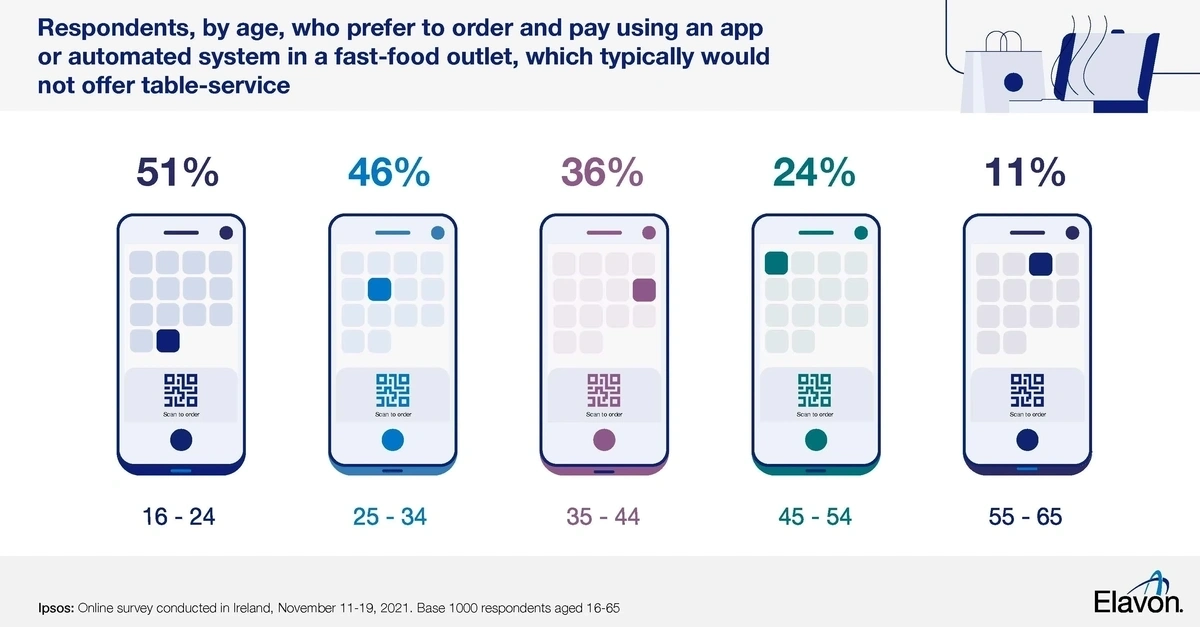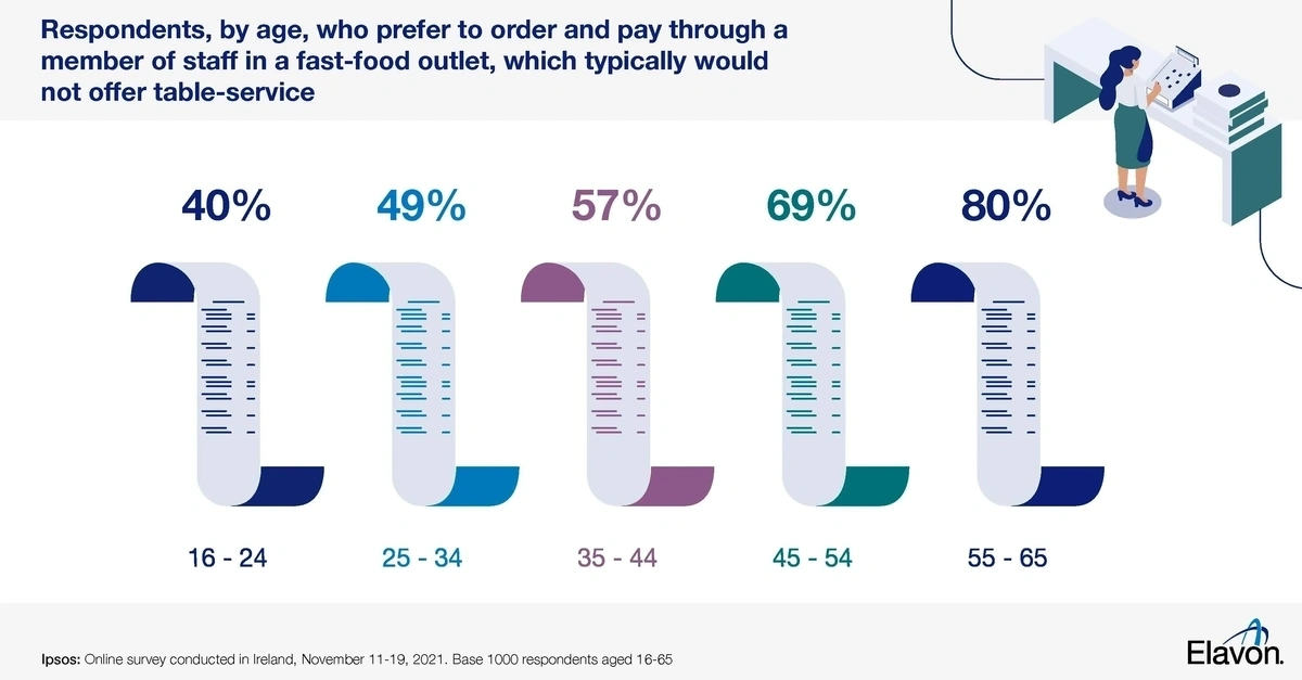 Of that same 55-65 group, 80% prefer to order and pay in a fast food outlet through a member of staff, while more than two in three respondents (69%) aged 45-54 prefer a face-to-face transaction.